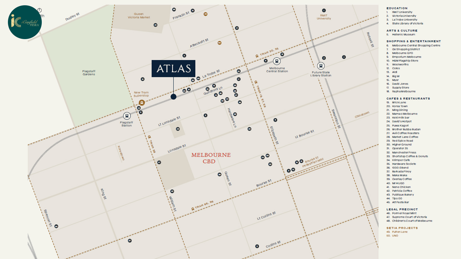Từ ATLAS, cư dân có thể dễ dàng tiếp cận Queen Victoria Market, RMIT University, University of Melbourne và Flagstaff Gardens chỉ trong vài phút. Đồng thời, hệ thống Free Tram Zone ngay trước cửa giúp việc di chuyển trong nội đô trở nên liền mạch và thuận tiện.