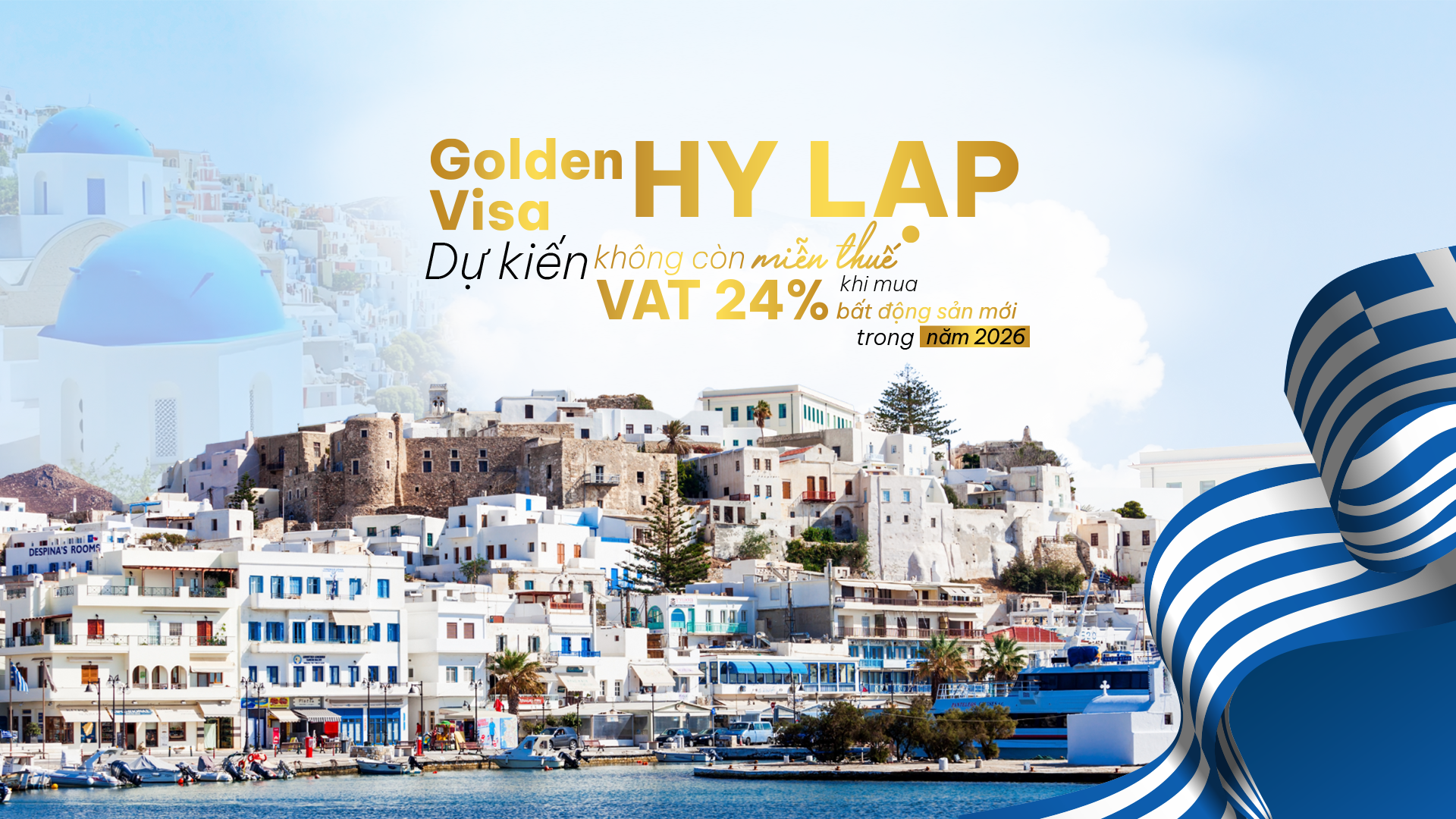 Theo thông tin từ Bộ Kinh tế và Tài chính Quốc gia của Hy Lạp (Hellenic Republic Ministry of Economy and Finace), bất động sản mới xây dựng sau năm 2006 tại Hy Lạp chịu mức VAT 24%. Nhằm thúc đẩy phát triển kinh tế và du lịch, chính phủ Hy Lạp đã áp dụng chính sách miễn thuế VAT cho một số dự án bất động sản. Tuy nhiên, ưu đãi này dự kiến sẽ kết thúc vào ngày 31/12/2025. Nếu không được gia hạn, kể từ ngày 01/01/2026, các nhà đầu tư mua bất động sản mới sẽ phải chịu mức VAT 24%, khiến chi phí đầu tư tăng thêm hàng chục nghìn EUR.